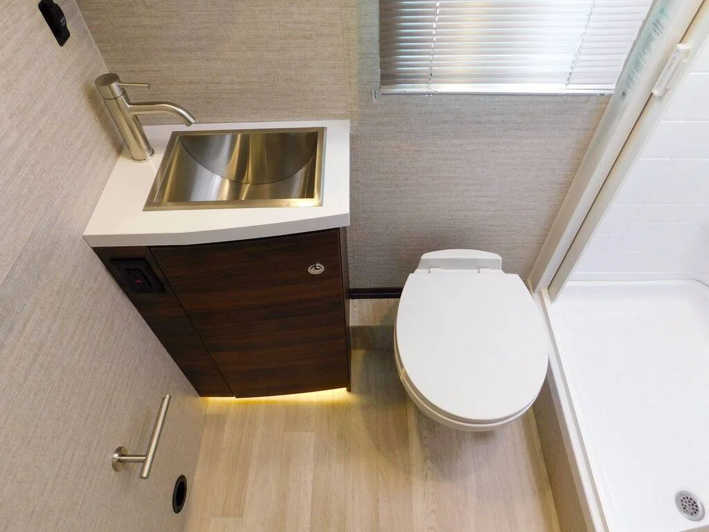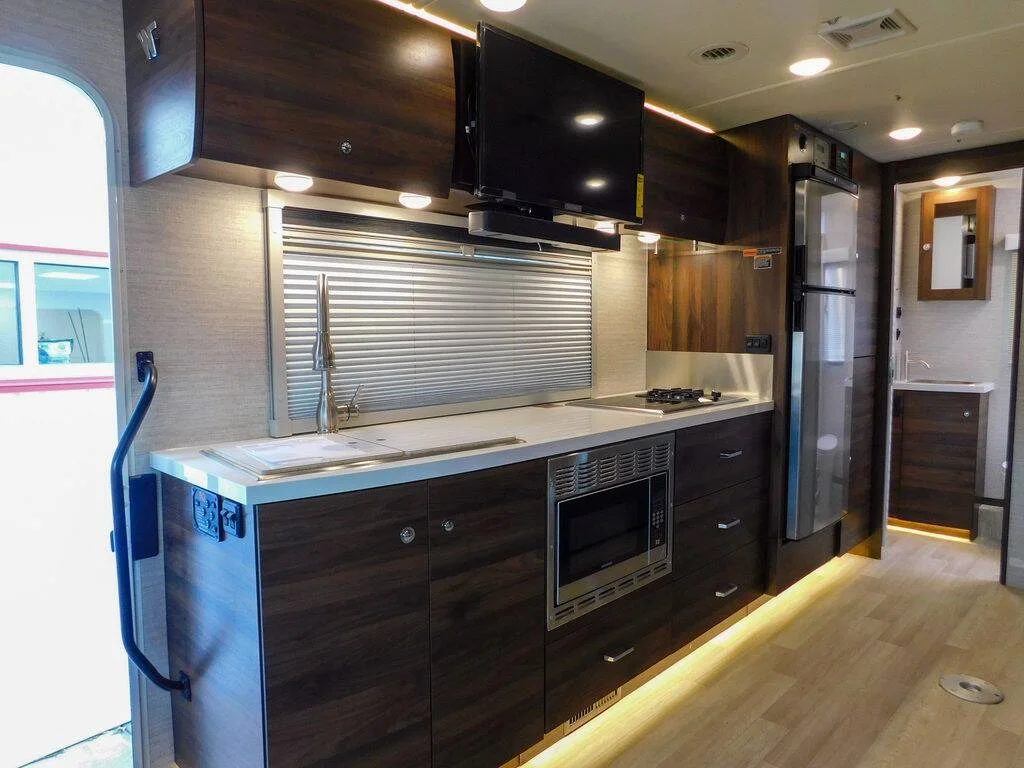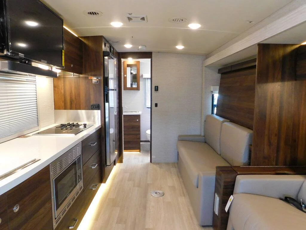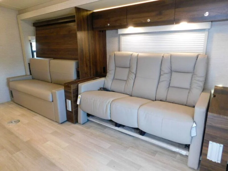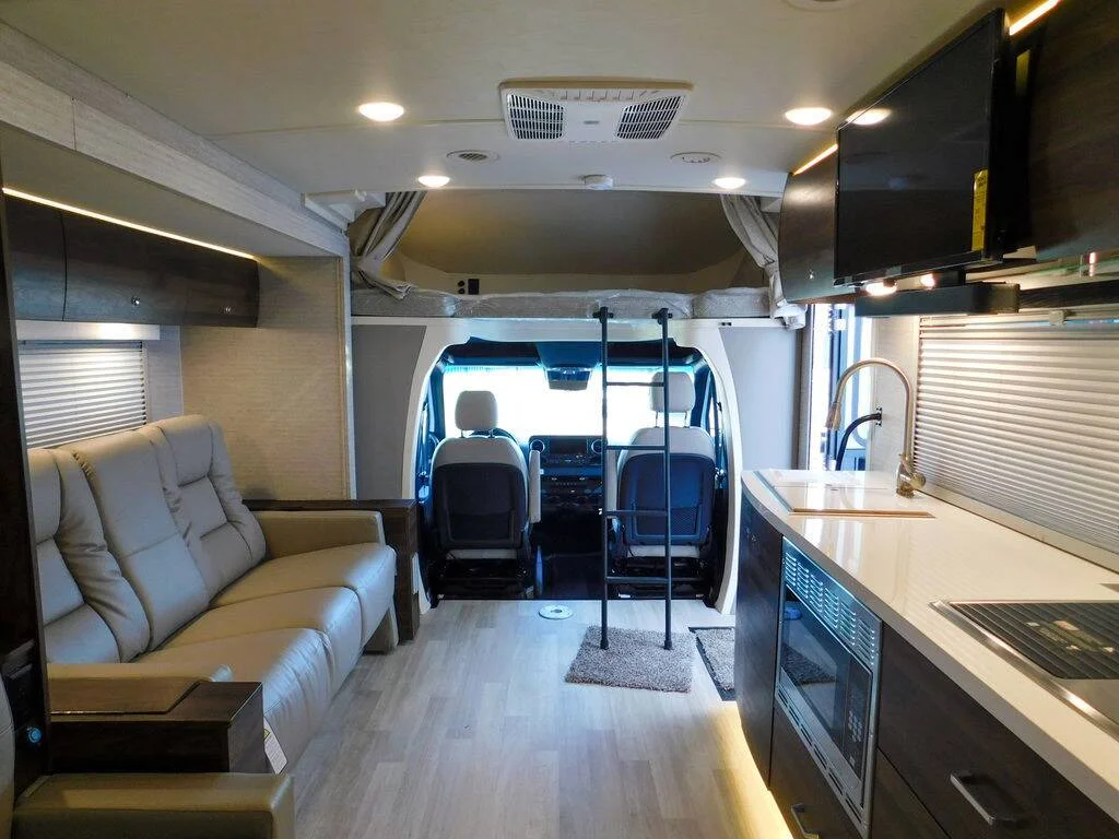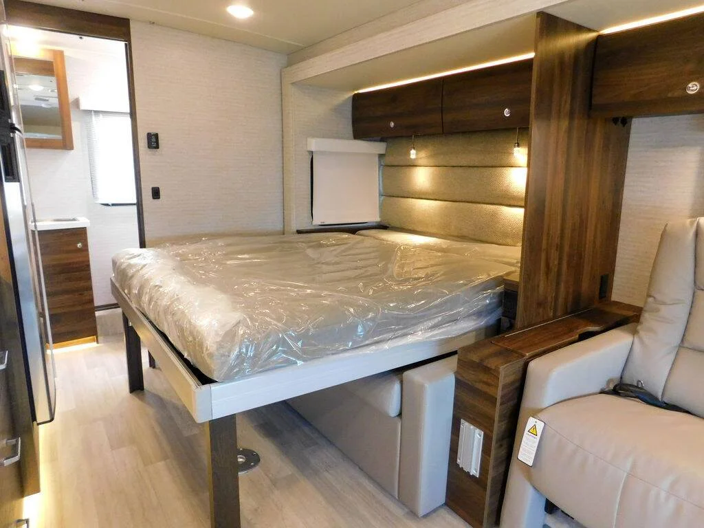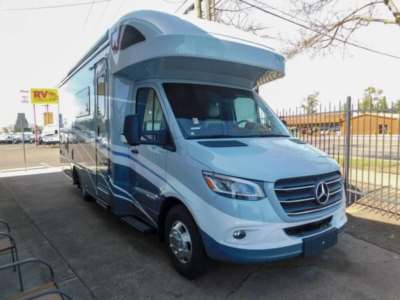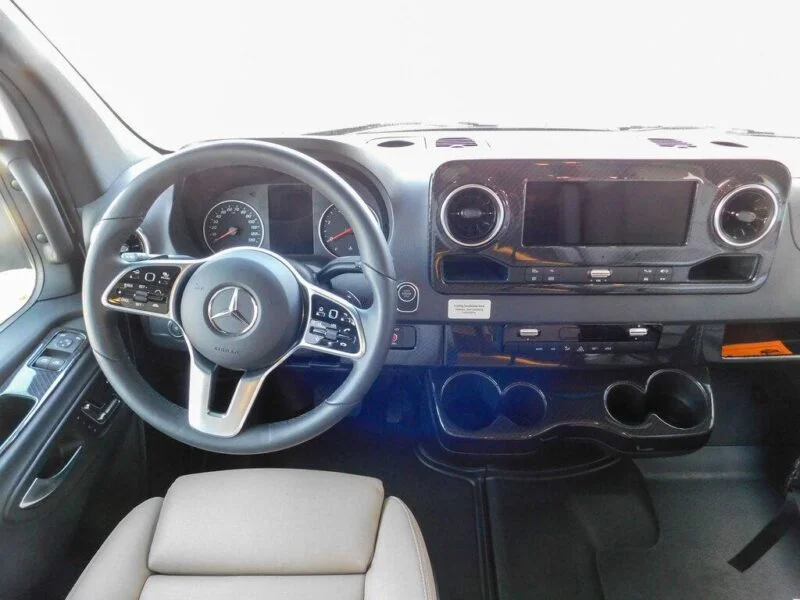 Features include: Exterior MBUX Touchscreen Multimedia Infotainment Center with Navigation, WiFi hotspot, Intelligent Voice Control and Rear Color Camera, Airbags driver, passenger, side and curtain, Heated power control cab seats — armrest, adjustable lumbar support, headrest, recline, slide, and manual swivel, 3-point seat belts, Climate control, Leather-wrapped steering wheel, Power door locks w/remote, Power windows, Power mirrors w/defrost and turn signals, Cruise control, Active lane keeping assist, Active braking assist, Rain sensor w/integrated wet wiper system, Power assist steering w/tilt wheel, 12V/USB PowerPoints, Folding windshield and cab window blinds, Dash appliqué package, 2 cab seat lounge cushions, Hill start assist, Crosswind assist, Attention assist, Interior 32″ HDTV, LED lights, Satellite system ready, Amplified digital HDTV antenna, Powered roof vent — rain cover, electric lift, remote control, thermostat operation (front bunk), MCD solar/blackout roller shades, Systems monitor panel, Tinted coach windows, Assist bar, Vinyl flooring throughout, Soft vinyl ceiling, 110V/12V/USB charging stations, Roof wiring access port, Toe kick lighting.