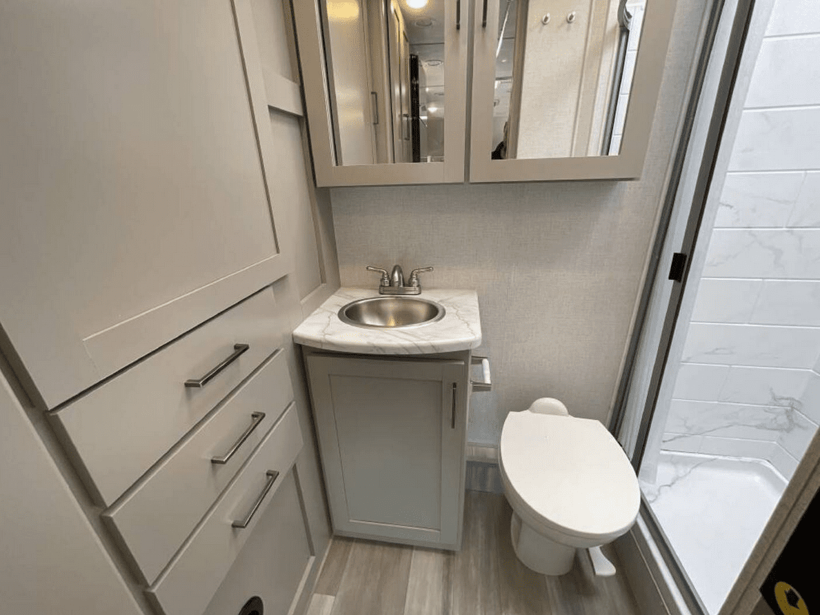 Full Bathroom Includes a stand-up shower, toilet, and vanity so you can stay fresh no matter where you roam.