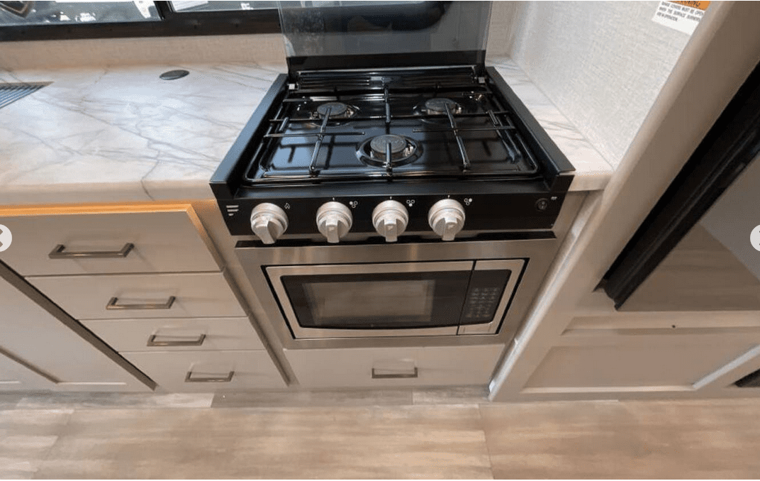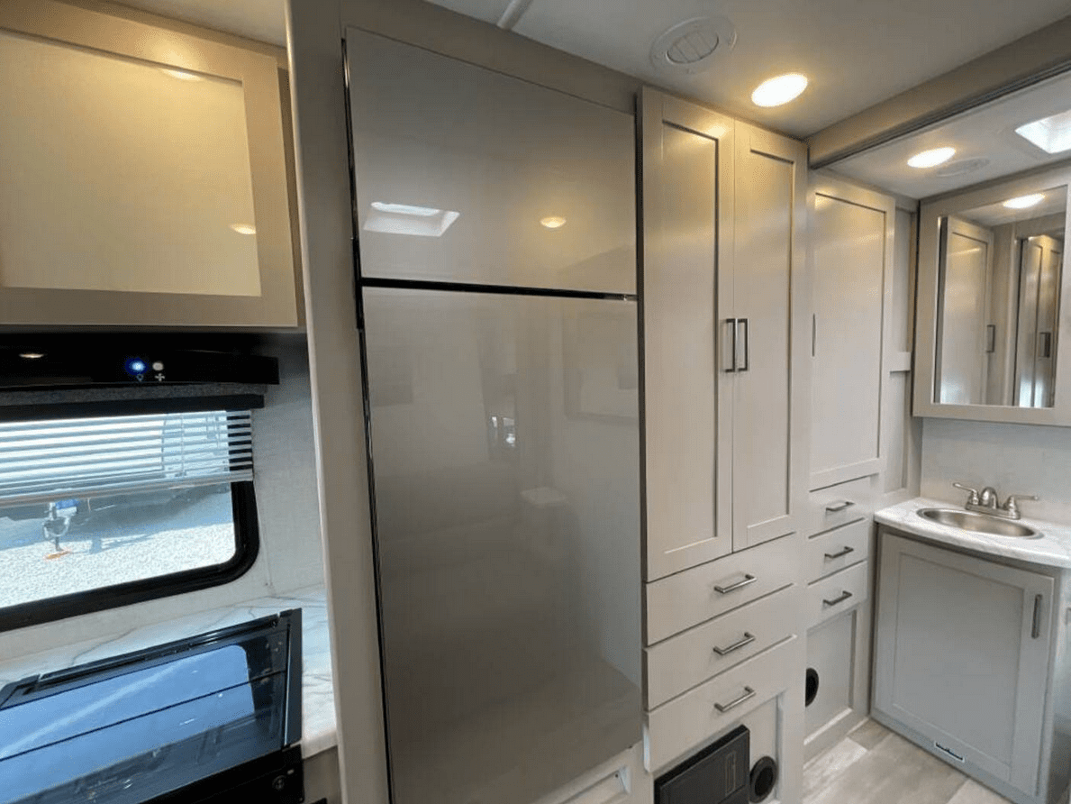 Fully Equipped Kitchen Cook on the go with a 2-burner stove, microwave, refrigerator, and a deep sink all surrounded by modern cabinetry and sleek finishes.